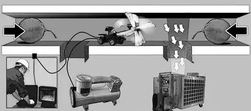 3、在中央空調(diào)風(fēng)管的適當(dāng)位置開兩個孔,然后再在這兩個開孔的位置的外側(cè)使用封堵氣囊堵住管道的兩端。