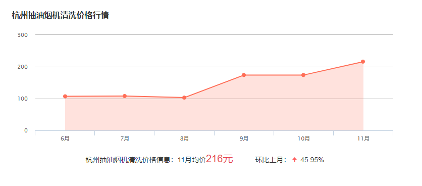 杭州找人洗油煙機的費用一般在120-300元左右,具體的價格與油煙機的規(guī)格和清洗難度有關(guān),下面為杭州近幾個月油煙機清洗的價格行情圖,僅供參考: