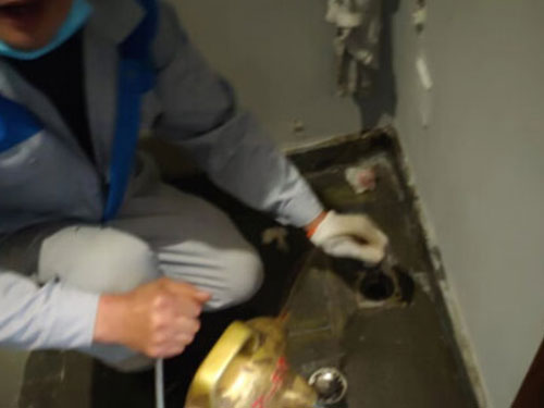 4、靠近角筏接一條足以通到堵點(diǎn)的軟管,把軟管放進(jìn)地漏至塞不進(jìn)去,然后用毛巾盡量堵住地漏口,而后開完角筏水量,同時(shí)用力壓住地漏口毛巾盡量不讓水往外返。反復(fù)一至二次能通則通,不通及止。