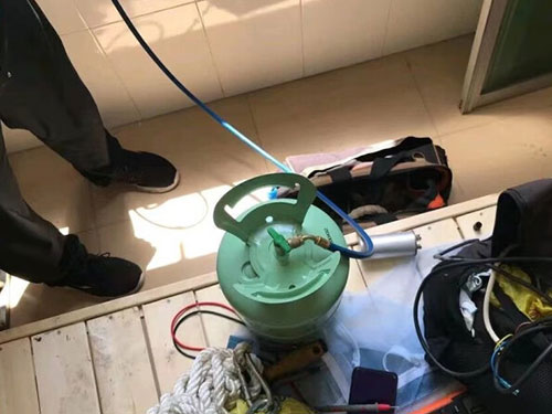 五、把空調(diào)主機(jī)這邊連接的粗管卸開,把做好的納子擰到粗管接口上,細(xì)管也卸開,把細(xì)管閥門關(guān)上四分之三,把氟瓶使用工藝管連到空調(diào)工藝口,打開氟瓶,像空調(diào)里灌液態(tài)制冷劑,等到細(xì)管接口向外噴液態(tài)制冷劑了,馬上關(guān)死細(xì)管閥門。