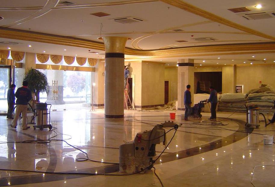 客戶為了避免大理石今后再泛起水漬、泛銹,和遭受其它污染,對研磨后地面施加防護,我們吸取了原防護變色的教訓,選用幾種較好的防水劑,取同樣的石材做了實驗,一方面檢查防護效果,另一方面檢查是否改變石材顏色,并根據(jù)吸水率確定工藝用量。做好了上述預備后,我們才大面積的對地面進行了防護處理。防護處理我們主要抓好以下工藝:①清潔石面。②充分干燥。③平均涂刷防護劑,潤透石面,不得漏刷,不能過多,防止蘊蓄,前者影響防護效果,后者影響美觀并加大清理難度。④天然前提下,透風干燥24以上。
