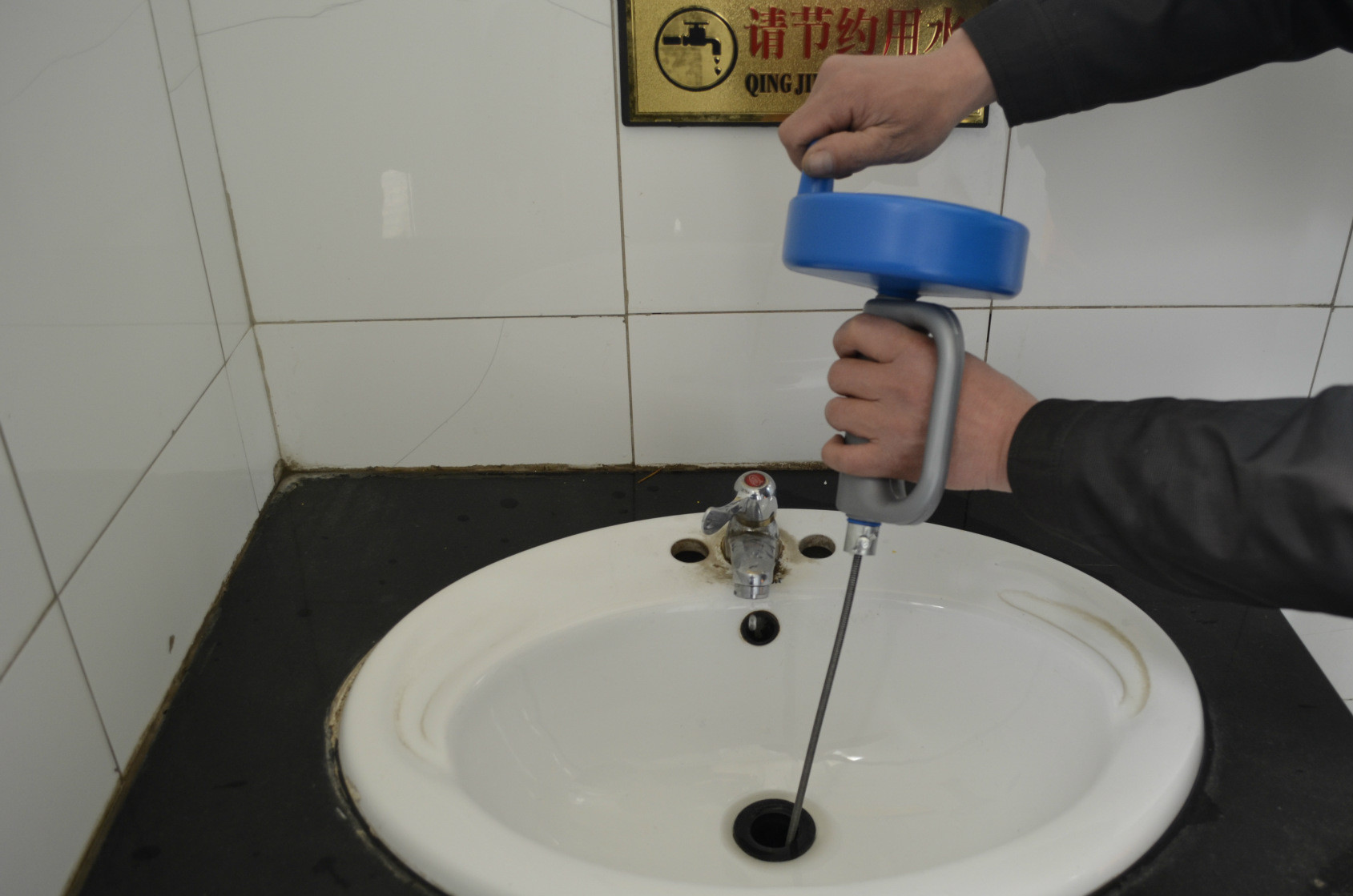 5、倒入化學制劑以后,靜待10-20,再往管子里倒入一壺滾開水,這個時候,你就會聽到本來堵得死死的管道有撒氣的聲音。這個時候,需要兩個人一起來操作,一個人手扶住彈簧鋼絲,另一個人來搖后面的手柄,多搖幾次以后,鋼絲就會繼續(xù)往下通。開始可能不太好操作,慢慢來,多搖一會兒就會通了。