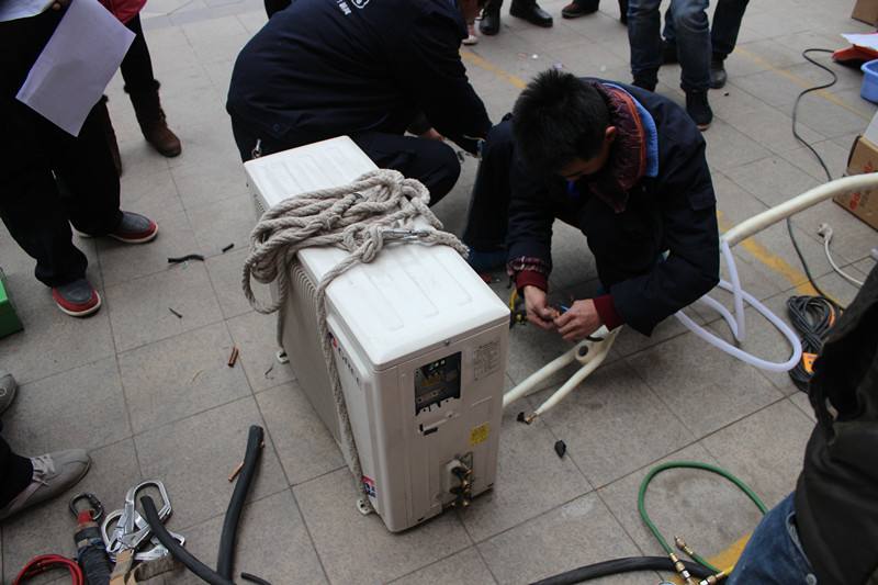 這一步非常重要,因?yàn)樯婕暗脚艢夤ぷ。正?guī)安裝方法是先將低壓管連接好,再將高壓管接好后,送上1圈,打開高壓閥門,聽到有氣體流出的絲絲聲,直到高壓接口有氟利昂噴出,立即擰緊高壓管接口,就完成排氣工作。